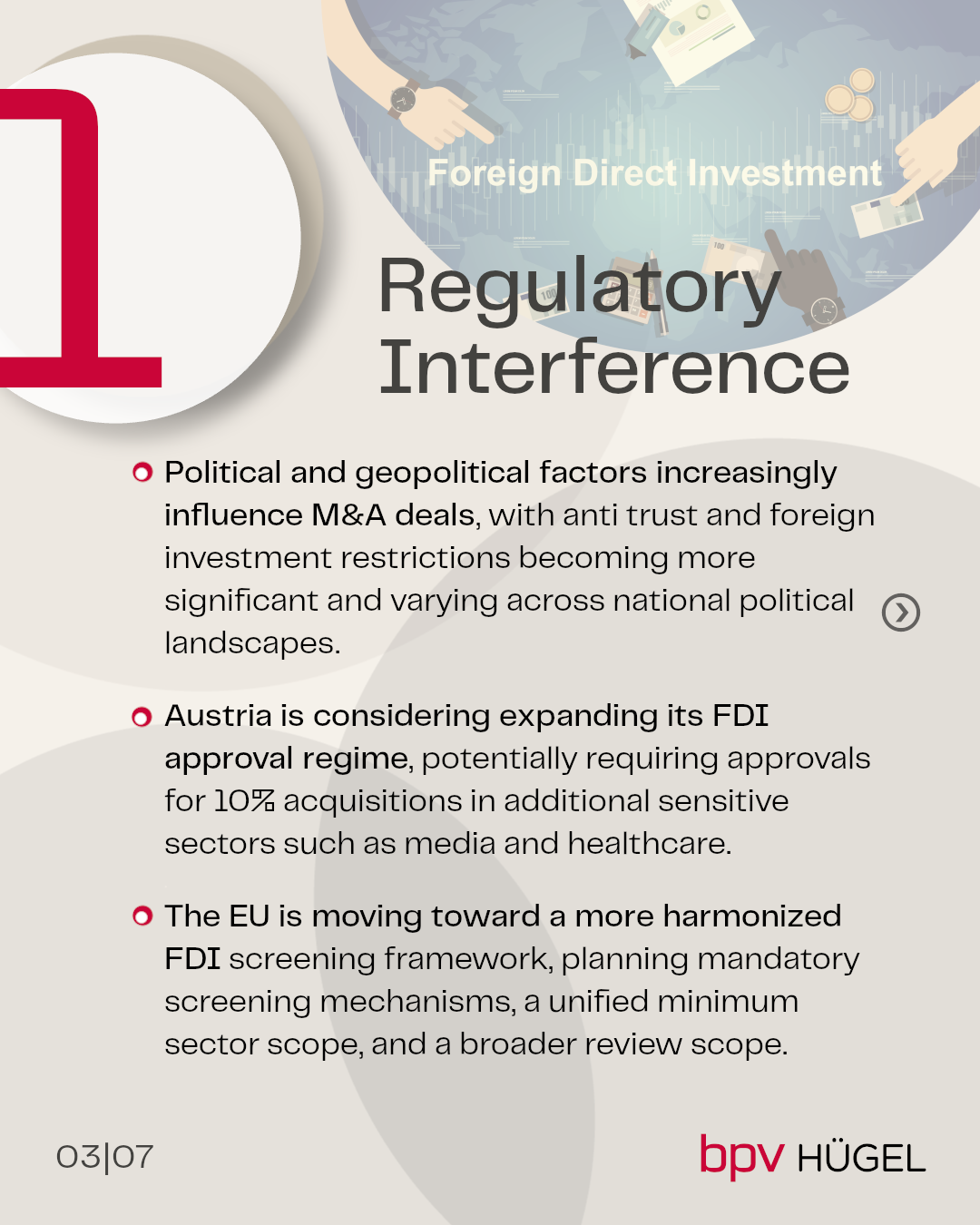 - Austria is considering expanding its FDI approval regime, potentially requiring approvals for 10% acquisitions in additional sensitive sectors such as media and healthcare.